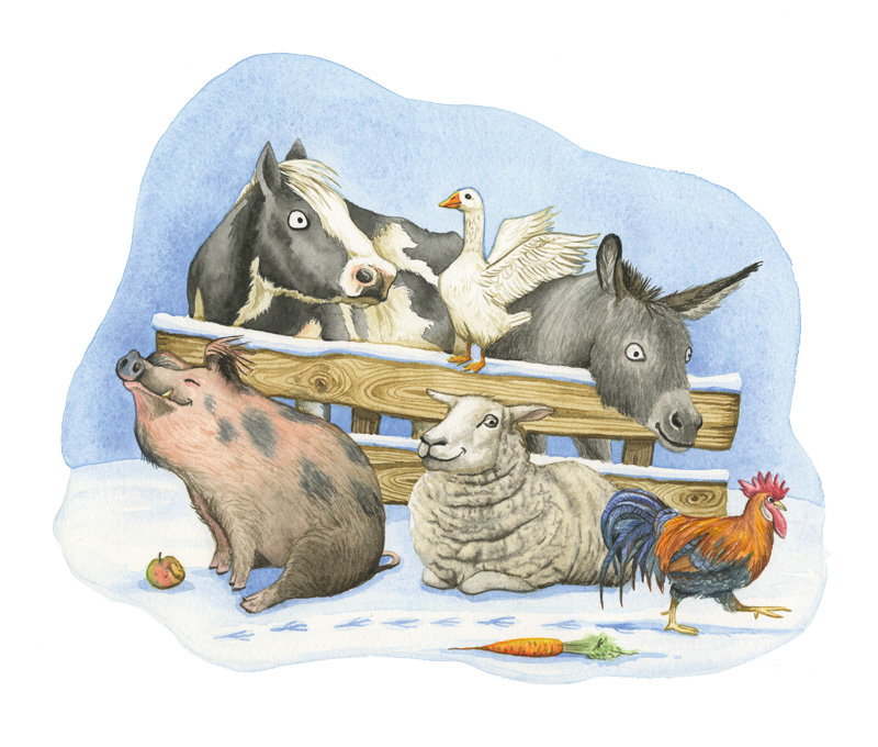 Die Christpost erschien nun zum 61. Mal und wird zu Weihnachten an die Freunde des Hauses Westkreuz versendet. Zu dieser weihnachtlichen Kurzgeschichte ist diese Illustration von Tierfreunden auf dem Bauernhof entstanden.
