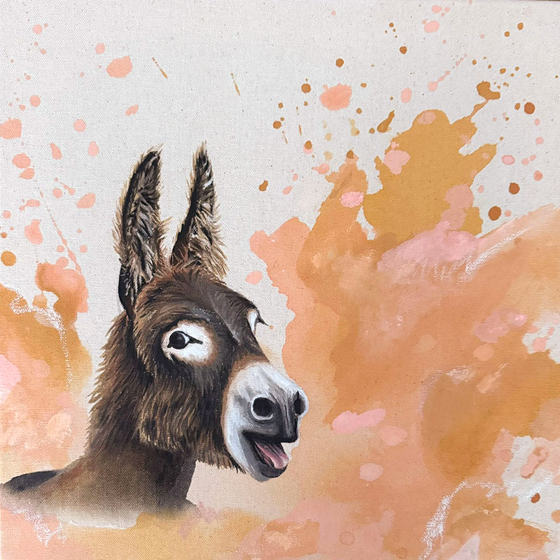 Der freche, strubbelige Esel wird sofort dein Herz erobern. Der klecksige Hintergrund in lebhaften Farben wie lichtem Ocker, zartem Rosa und gedecktem Goldgelb bildet eine gute Farbharmonie zum dunklen Fell des Esels. Ein Wortspiel wie zum Beispiel "Take it Easel" bringt noch mehr Humor und Charme ins Spiel und kann auf Wunsch ergänzt werden.