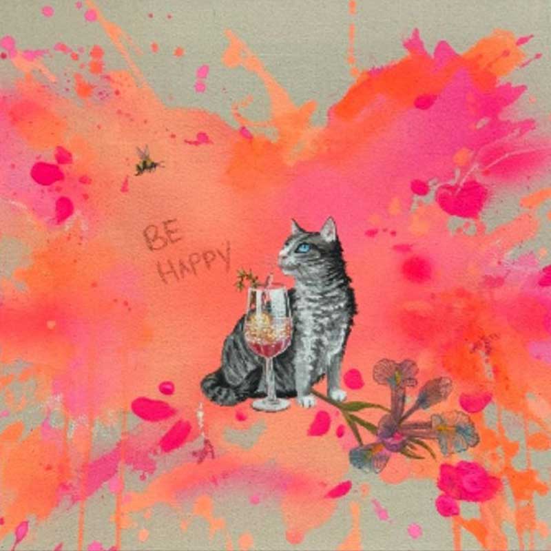 Stell dir ein lebendiges Kunstwerk vor, das sofort gute Laune verbreitet! Die Katze mit dem Cocktailglas und die Biene sind in kräftigen Acrylfarben auf Leinwand gemalt – ein verspieltes Duo, das Spaß und Leichtigkeit ausstrahlt. Durch zarte Pflanzenelemente in Aquarell werden sie wunderbar ergänzt und verleihen dem Bild eine frische, natürliche Note. Das Gesamtbild strahlt eine intensive Sommerstimmung in warmen Orange-, Pink- und Rosatönen aus, die sofort an sonnige Tage erinnert. Mit dem liebevollen Spruch „be happy“, der in Kreide ergänzt wurde, lädt dieses Kunstwerk dazu ein, das Leben mit einem Lächeln zu genießen. Perfekt, um deinem Zuhause eine fröhliche, sommerliche Atmosphäre zu verleihen!