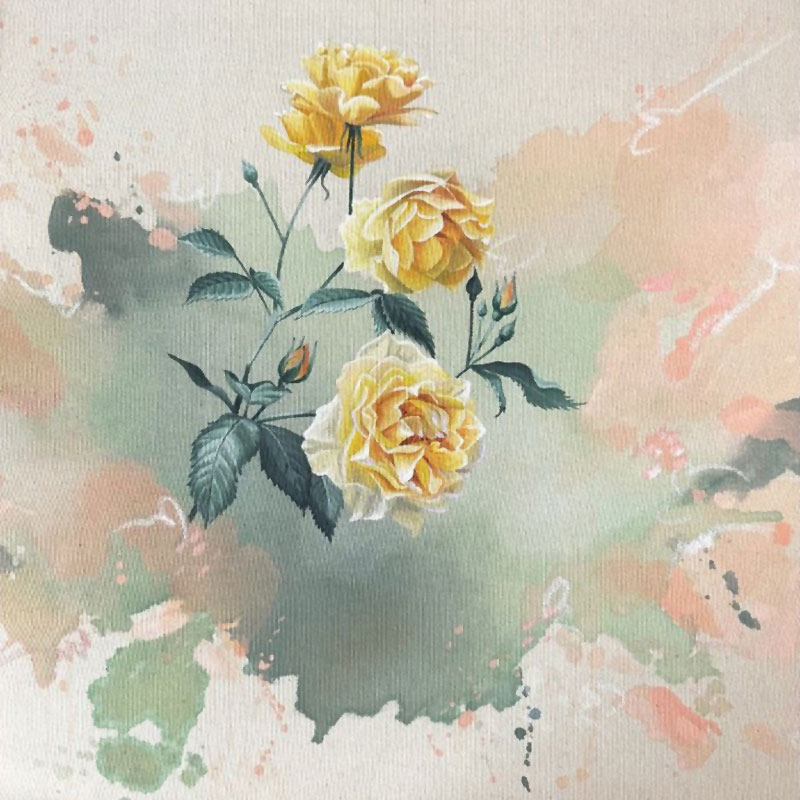 Hier trifft sanfte Eleganz auf ruhige Melancholie. Die zarten hellen Rosen vor einem nebulösen Hintergrund aus Grün, Beige und einem Hauch Rosa. Das Bild strahlt Ruhe, Hoffnung und Liebe aus und lädt zum Träumen und Nachdenken ein. Ein Kunstwerk für alle, die zarte Schönheit und poetische Stimmung lieben