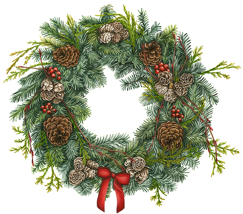 Ein hängender Adventskranz zur Weihnachtszeit mit Tanne, Tannenzapfen, Kienappel, roten Vogelbeeren und einer roten Schleife im unteren Kranz.