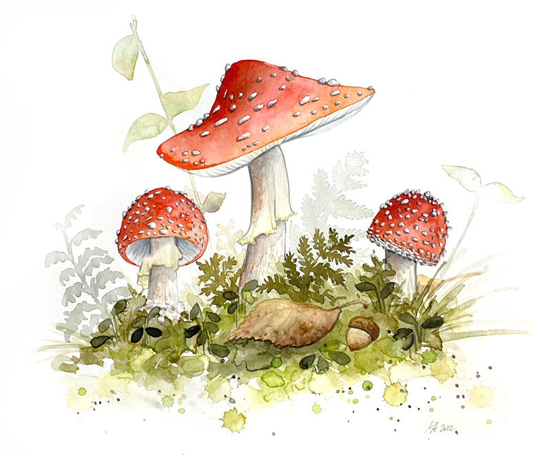 In der Mitte des Motivs spitz zulaufender Fliegenpilz mit an den Seiten links und rechts stehenden kleinen Fliegenpilzen mit runden Kappen. Die drei Fliegenpilze sind auf einem dekorativen Waldboden arrangiert. Lockere Umsetzung in Aquarell
