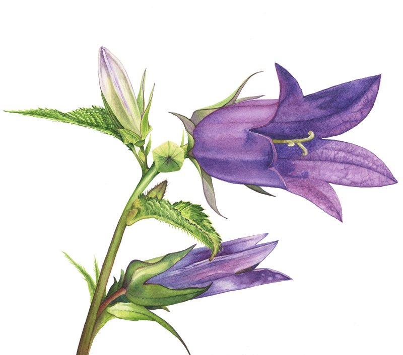 erblühte Glockenblume in violet mit Stiel und Ansatz von Blättern, botanische Zeichnung in Aquarell. Verschiedene Knospenstadien.