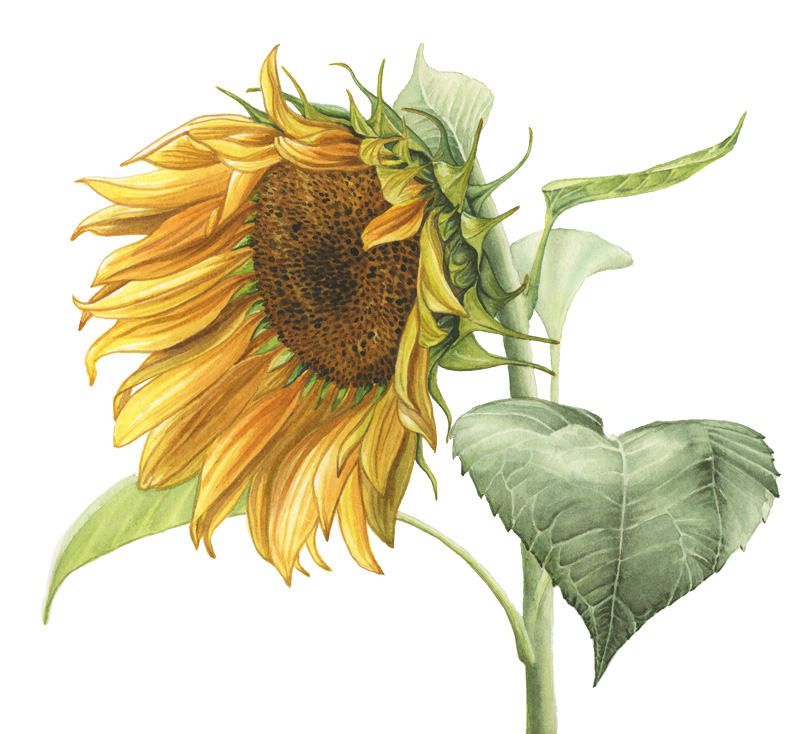erblühte Sonnenblume im halbseitlichen Potrait mit Stiel und Ansatz von Blättern, botanische Zeichnung in Aquarell.