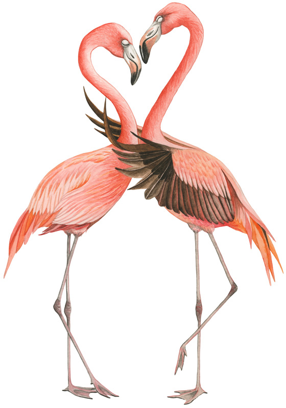 Zeichnung in Aquarell, rosafarbende Flamingos in einer zärtlichen Umarmung mit geschlossenen Augen