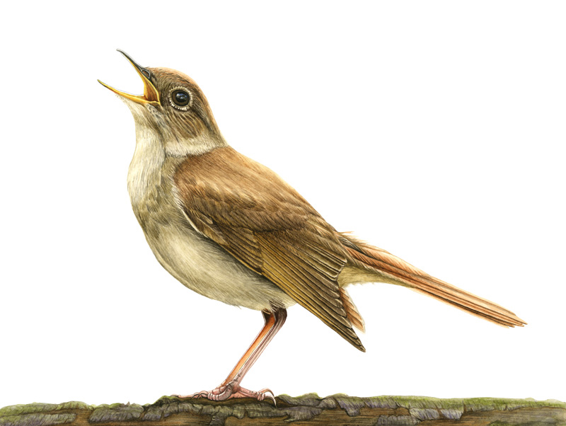 Zeichnung in Aquarell, Nachtigall sitzt auf einem Ast und singt, das braune unscheinbare Gefieder ist detailreich zu erkennen
